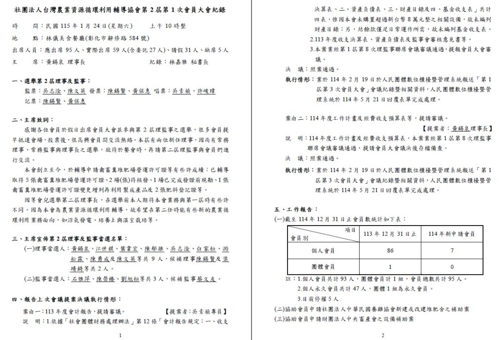 本會第2屆第1次會員大會 Posted on 2026-02-102026-02-10 By tarrca 開會事由:第2屆第1次會員大會暨理事、監事選舉開會時間:中華民國114年1月24日(星期六) 上午10時整開會地點:林儀美食餐廳(彰化市辭修路584號)主持人:黃錫泉 理事長備註:第2屆第1次會員大會暨理事、監事選舉會後,召開第2屆第1次理監事聯席會議 協會活動, 協會訊息